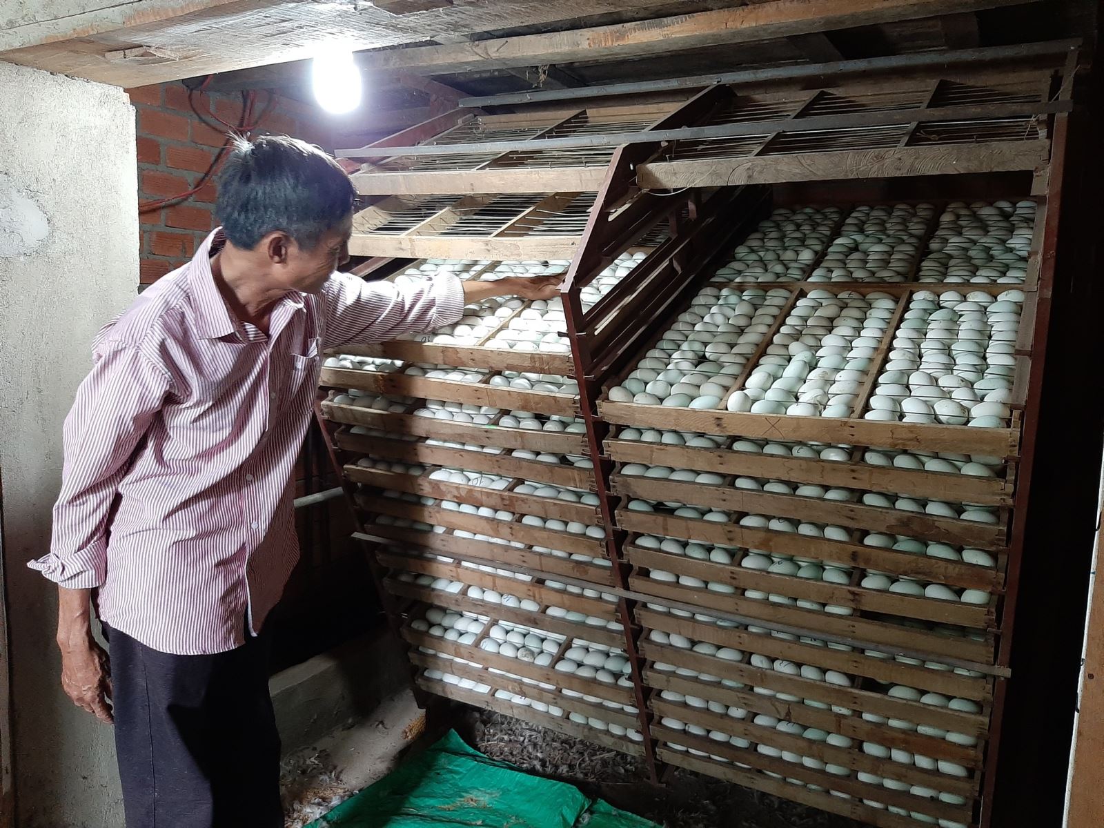 Anh Hán Vinh Hà Chi hội trưởng Chi hội Cựu chiến binh thôn sơn Trà , xã Bình Hòa đang kiểm tra trứng vịt lộn tại lò ấp