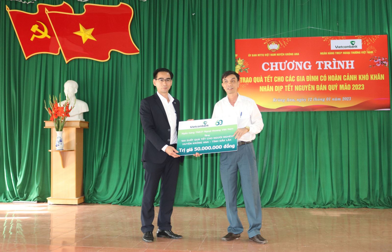Nhân dịp này, UBMTTQ Việt Nam huyện đã trao thư và tặng hoa cảm ơn đối với Ngân hàng Thương mại Cổ phần Ngoại thương Việt Nam Chi nhánh Đắk Lắk đã tài trợ, quan tâm đến đời sống kinh tế hộ nghèo, hộ có hoàn cảnh khó khăn trên địa bàn huyện Krông Ana.