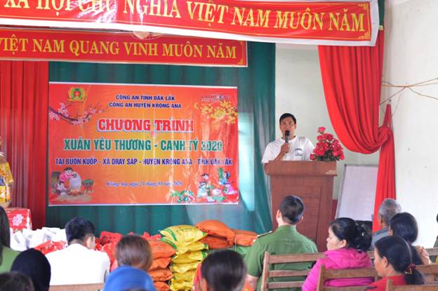 Ngày 21/01/2020, hưởng ứng kế hoạch Tình nguyện mùa đông, xuân biên cương, tết hải đảo 2020, Công an huyện đã phối hợp với Công ty TNHH xe máy Lai Hương tổ chức Chương trình “Xuân yêu thương” tại Buôn Kuốp, xã Dray Sáp, huyện Krông Ana. Tham dự chương trình có đồng chí Thiếu tá Tạ Hoàng Sơn – Phó Trưởng Công an huyện, ông Nguyễn Thanh Dũng – Đại diện Công ty xe máy Lai Hương cùng đông đảo các bạn đoàn viên, hội viên hội phụ nữ và nhân dân Buôn Kuốp, xã Dray Sáp.