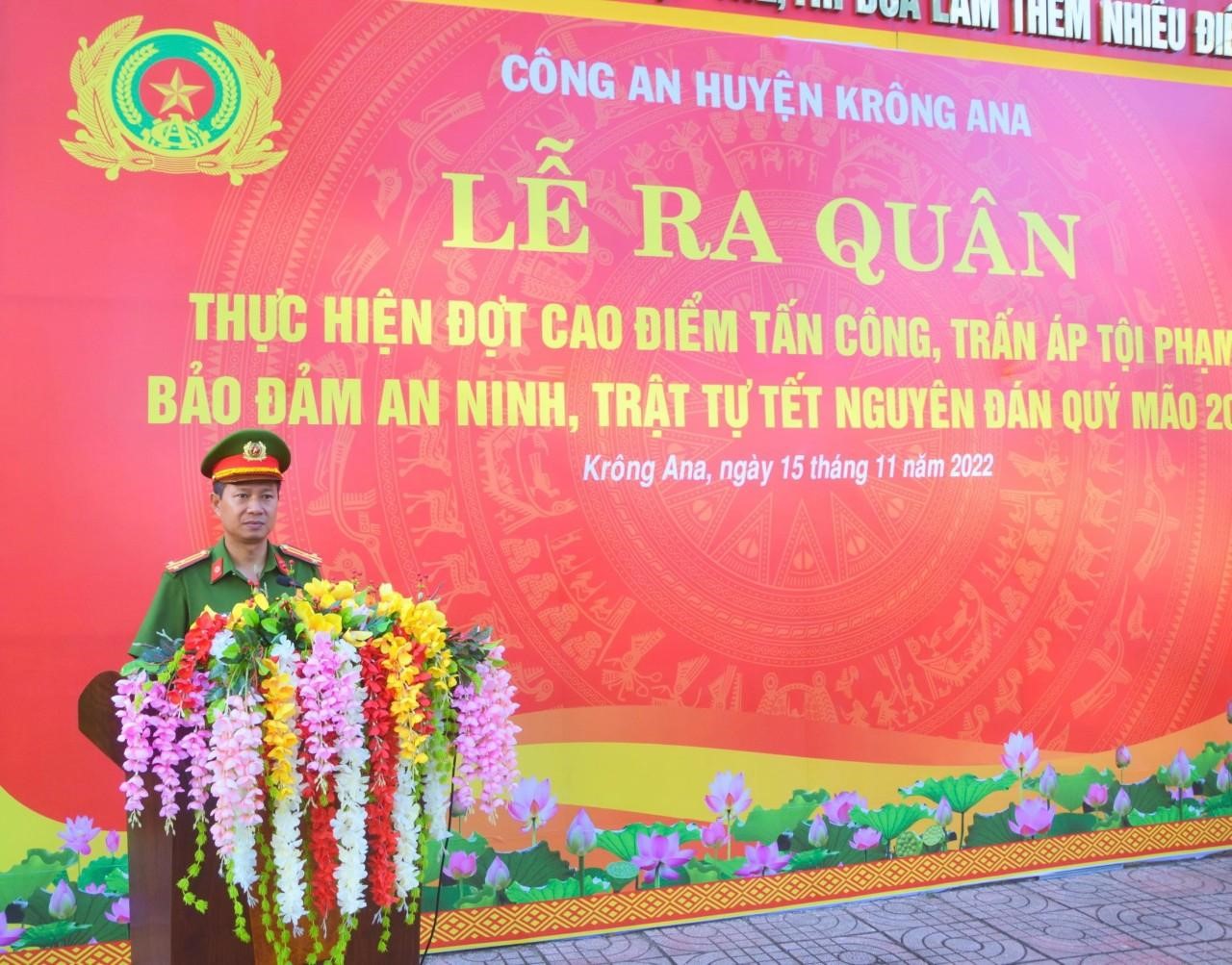 Hòa chung không khí thi đua sôi nổi của toàn quốc đồng loạt ra quân tấn công trấn áp tội phạm. Ngày 15/11/2022 Công an toàn huyện Krông Ana tổ chức Lễ ra quân mở đợt cao điểm tấn công trấn áp tội phạm, đảm bảo an ninh trật tự Tết Nguyên đán Quý Mão 2023.