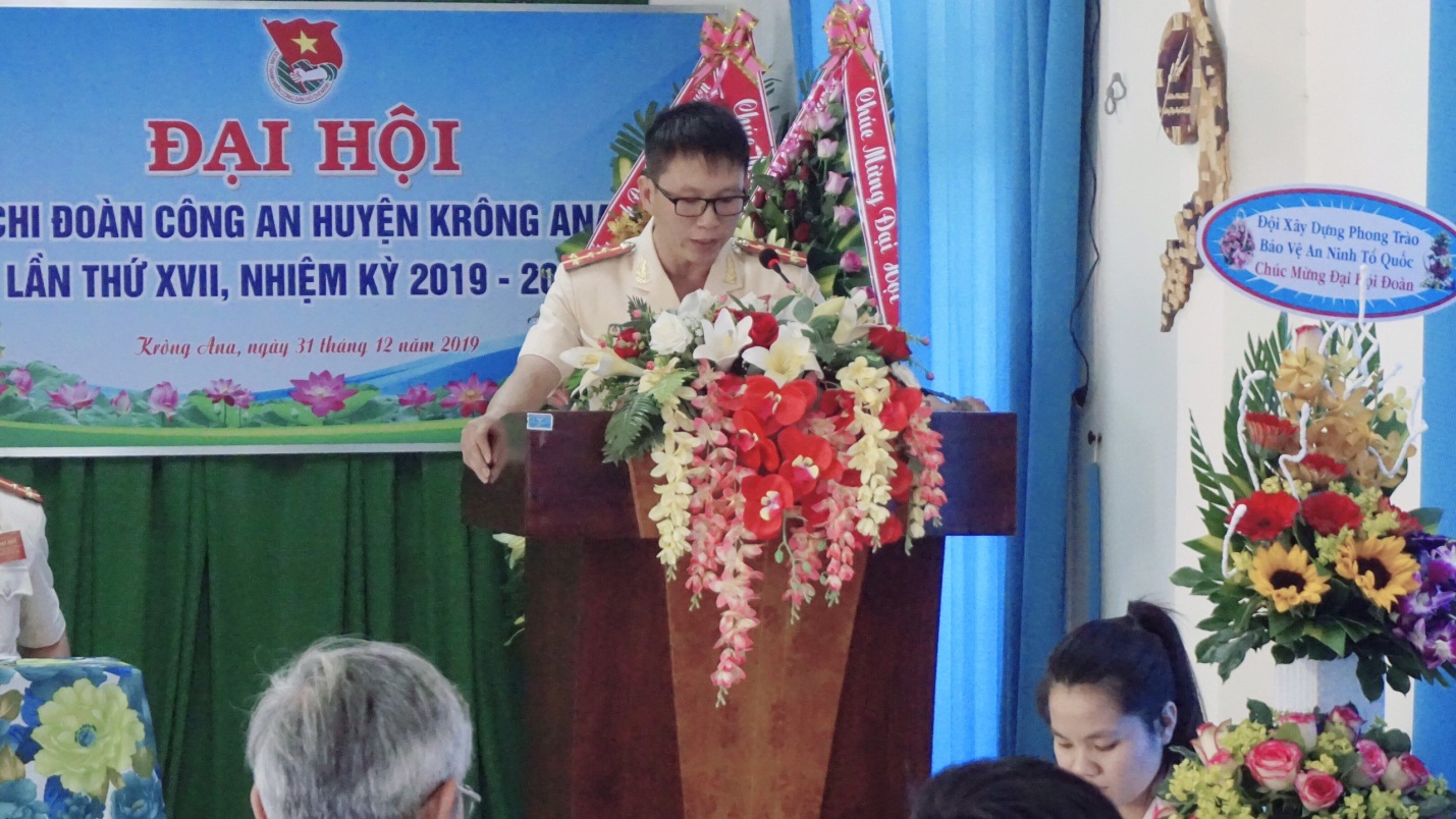 Ngày 31/12/2019, Đoàn thanh niên Công an huyện Krông Ana tổ chức Đại hội nhiệm kỳ 2019 – 2022. Tham dự Đại hội có các đồng chí: Thượng tá Nguyễn Ngọc Lâm – Phó Bí thư Đảng ủy, Phó trưởng Công an huyện; Đại úy Lê Ngọc Thắng - Phó Bí thư Đoàn Công an tỉnh; đồng chí Nguyễn Duy Hoàng - Bí thư Huyện đoàn; các đại biểu khách mời cùng toàn thể đoàn viên Chi đoàn Công an huyện.