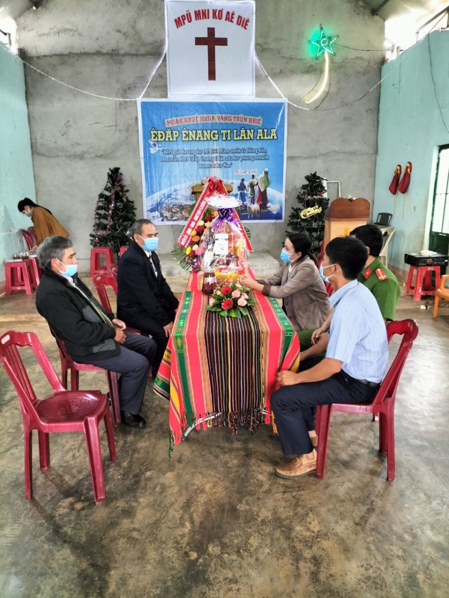 Đại diện cho Đảng ủy, Chính quyền xã bà H Djoen Bdap - PCT. UBND xã đã gửi lời chúc sức khỏe, Giáng sinh an lành, hạnh phúc đến Mục sư và bà con giáo dân; ân cần hỏi thăm tình hình đời sống, kinh tế và biểu dương bà con giáo dân, các tín đồ trong thời gian qua đã có nhiều đóng góp cho sự phát triển kinh tế - xã hội và công tác phòng chống dịch COVID-19 của địa phương, đồng thời mong muốn Mục sư tiếp tục vận động bà con sống “Tốt đời, đẹp đạo”, nêu cao tinh thần đoàn kết cùng Nhân dân trong xã chung tay phát triển kinh tế - xã hội, xây dựng xã Băng A Drênh ngày càng giàu đẹp, văn minh.