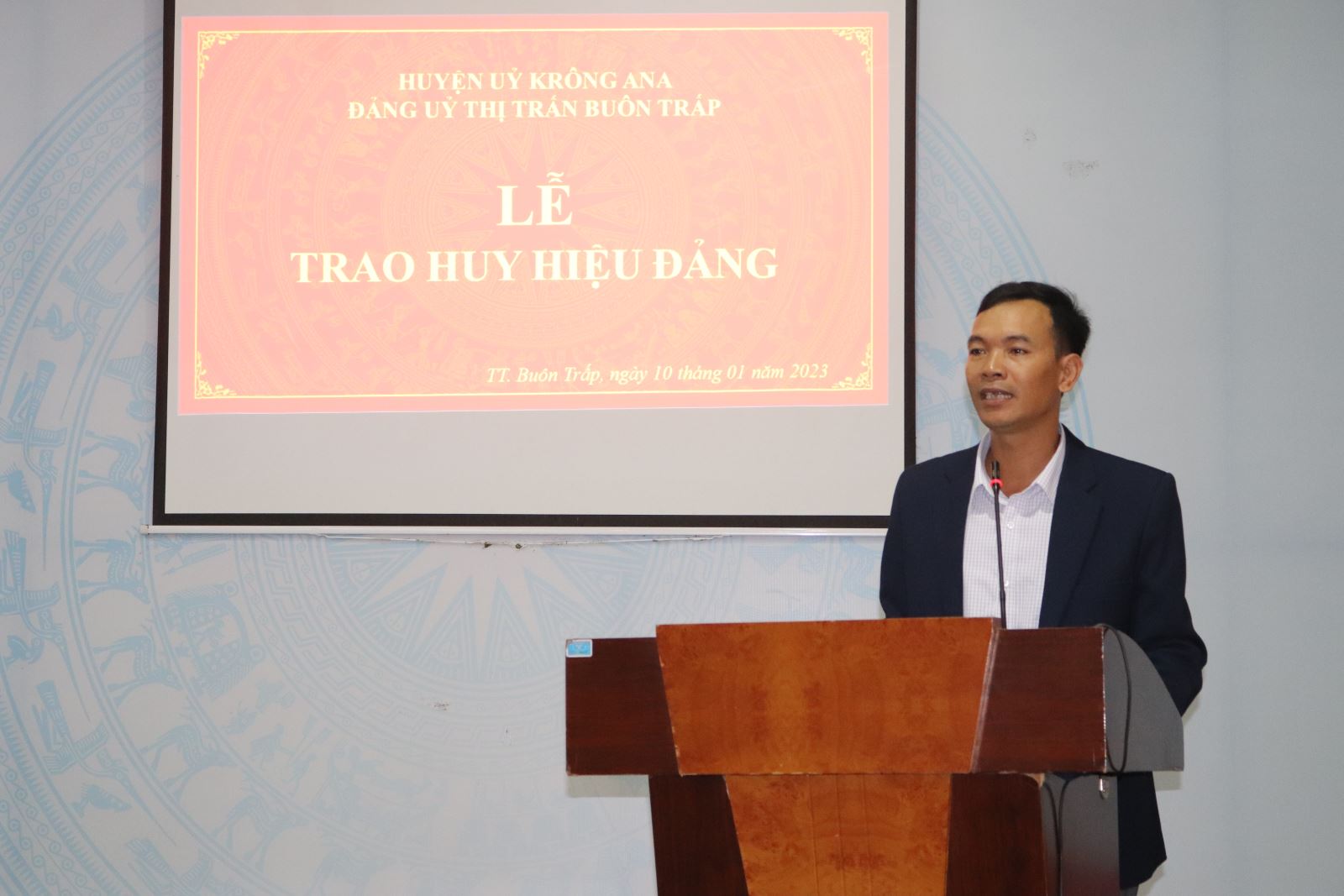 Phát biểu tại buổi lễ, đồng chí Y Ter Buôn Krông – Bí thư Đảng ủy thị trấn Buôn Trấp chúc mừng các đồng chí cao niên tuổi Đảng được nhận Huy hiệu Đảng đợt này. Đồng chí cũng khẳng định, việc trao Huy hiệu Đảng hôm nay đối với các đồng chí cao niên tuổi Đảng là thể hiện sự ghi nhận, trân trọng của Đảng, Nhà nước và nhân dân về sự đóng góp vào sự nghiệp đấu tranh giành độc lập dân tộc, xây dựng và bảo vệ Tổ quốc Việt Nam xã hội chủ nghĩa, sự phấn đấu, rèn luyện, cống hiến của các cô, chú và đồng chí. Đồng chí mong muốn các đồng chí cao niên tuổi Đảng luôn giữ gìn sức khỏe, tiếp tục phát huy phẩm chất đạo đức cách mạng của người đảng viên, có lập trường quan điểm vững vàng, tuyệt đối tin tưởng chủ nghĩa Mác - Lênin, tư tưởng Hồ Chí Minh, chấp hành nghiêm chỉnh Cương lĩnh chính trị, Điều lệ Đảng, nghị quyết, chỉ thị của Đảng, pháp luật của Nhà nước.