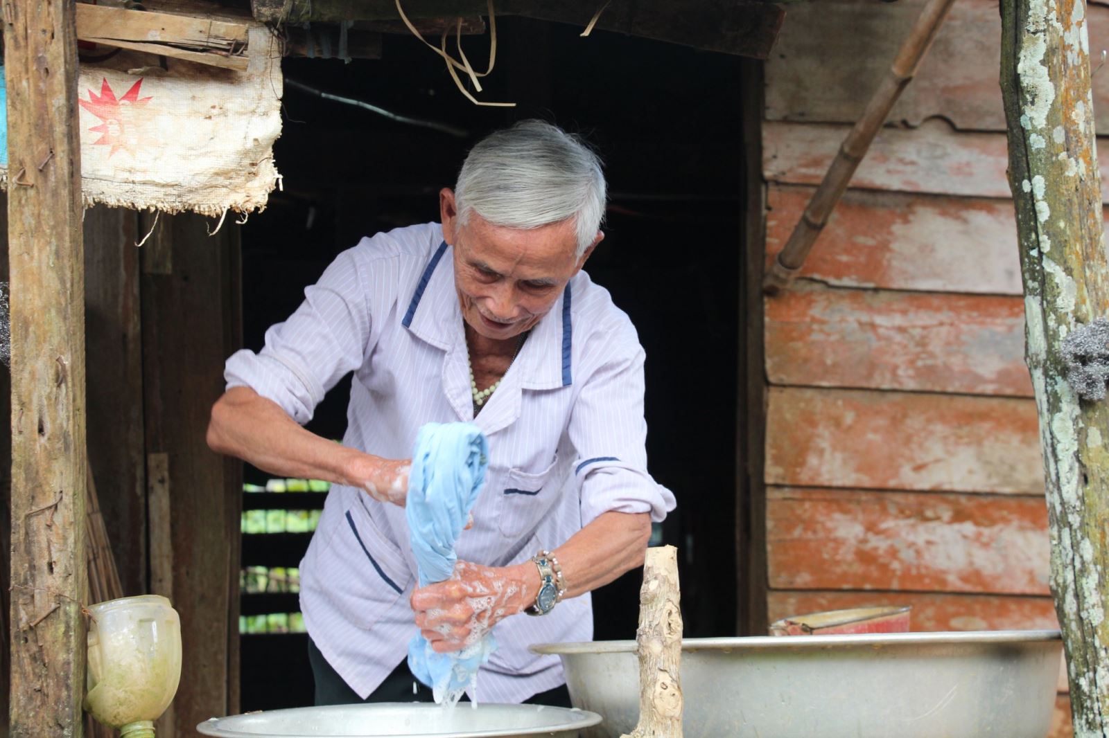 Cụ Lê Đóng đang giặt quần áo
