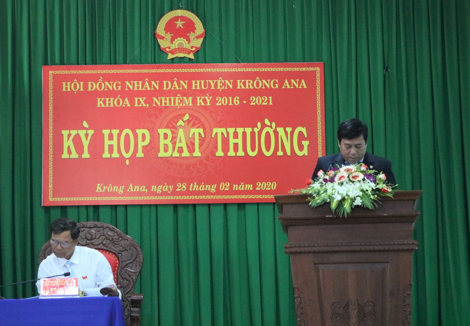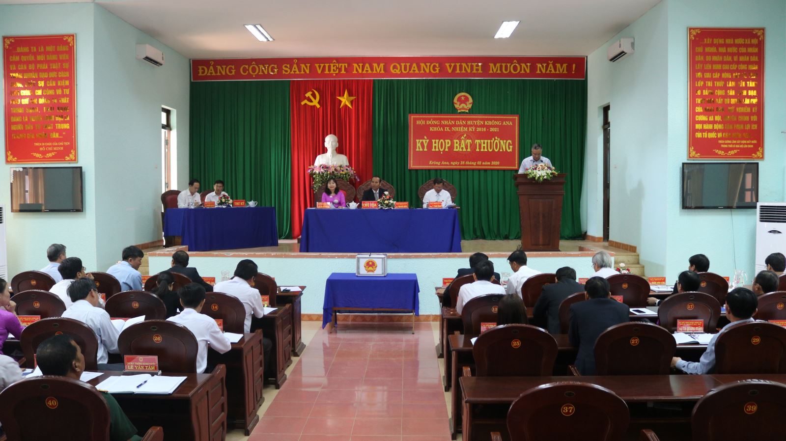 Thực hiện Luật Tổ chức chính quyền địa phương năm 2015 và Nghị quyết 629/2019/UBTVQH14 ngày 30/01/2019 của Uỷ ban Thường vụ Quốc hội về hướng dẫn một số hoạt động của HĐND, chủ trương của UBND tỉnh, Ban Thường vụ Huyện ủy về công tác cán bộ; sáng ngày 28/02/2020, HĐND huyện Krông Ana khóa IX, nhiệm kỳ 2016-2021 đã tổ chức kỳ họp bất thường. Tham dự kỳ họp có đồng chí Nguyễn Kính - Bí thư Huyện ủy; ông Y Nem Buôn Krông - Phó Bí thư Thường trực Huyện ủy, Chủ tịch HĐND huyện; các ông, bà trong Ban Thường vụ Huyện ủy, Thường trực HĐND, UBND huyện, UBMTTQVN huyện; lãnh đạo các cơ quan, ban, ngành, đoàn thể của huyện; 35/35 đại biểu HĐND huyện khóa IX.
