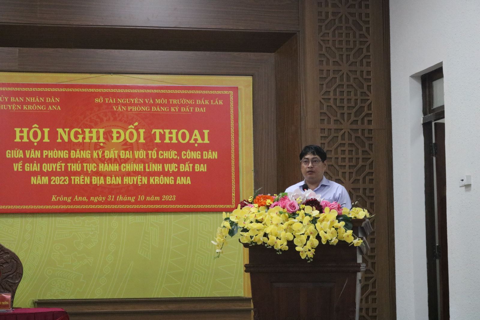 Sáng 31/10, Văn phòng Đăng ký đất đai Sở Tài nguyên và Môi trường phối hợp với UBND huyện tổ chức Hội nghị đối thoại với tổ chức, công dân về giải quyết thủ tục hành chính lĩnh vực đất đai năm 2023 trên địa bàn huyện. Hội nghị do ông Mai Văn Phúc, Giám đốc Văn phòng Đăng ký đất đai Sở Tài nguyên và Môi trường và ông Hoàng Minh Giám, Phó Chủ tịch Thường trực UBND huyện Krông Ana đồng chủ trì Hội nghị.
