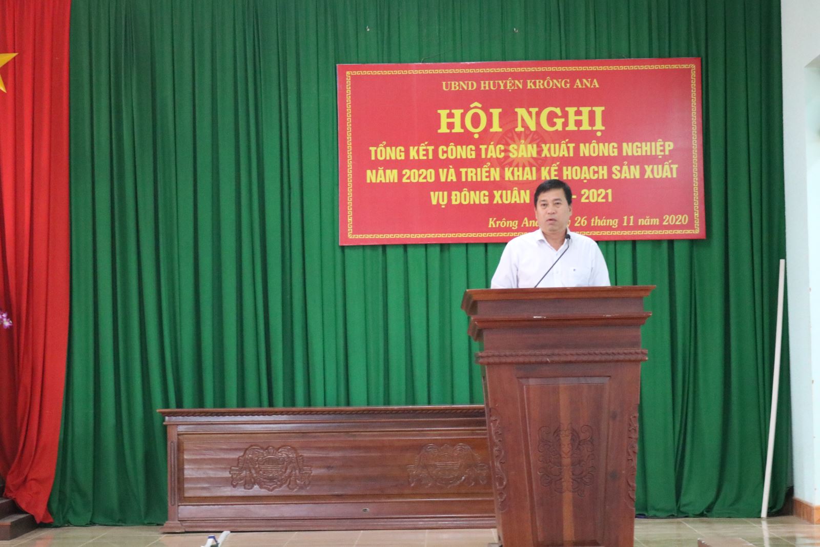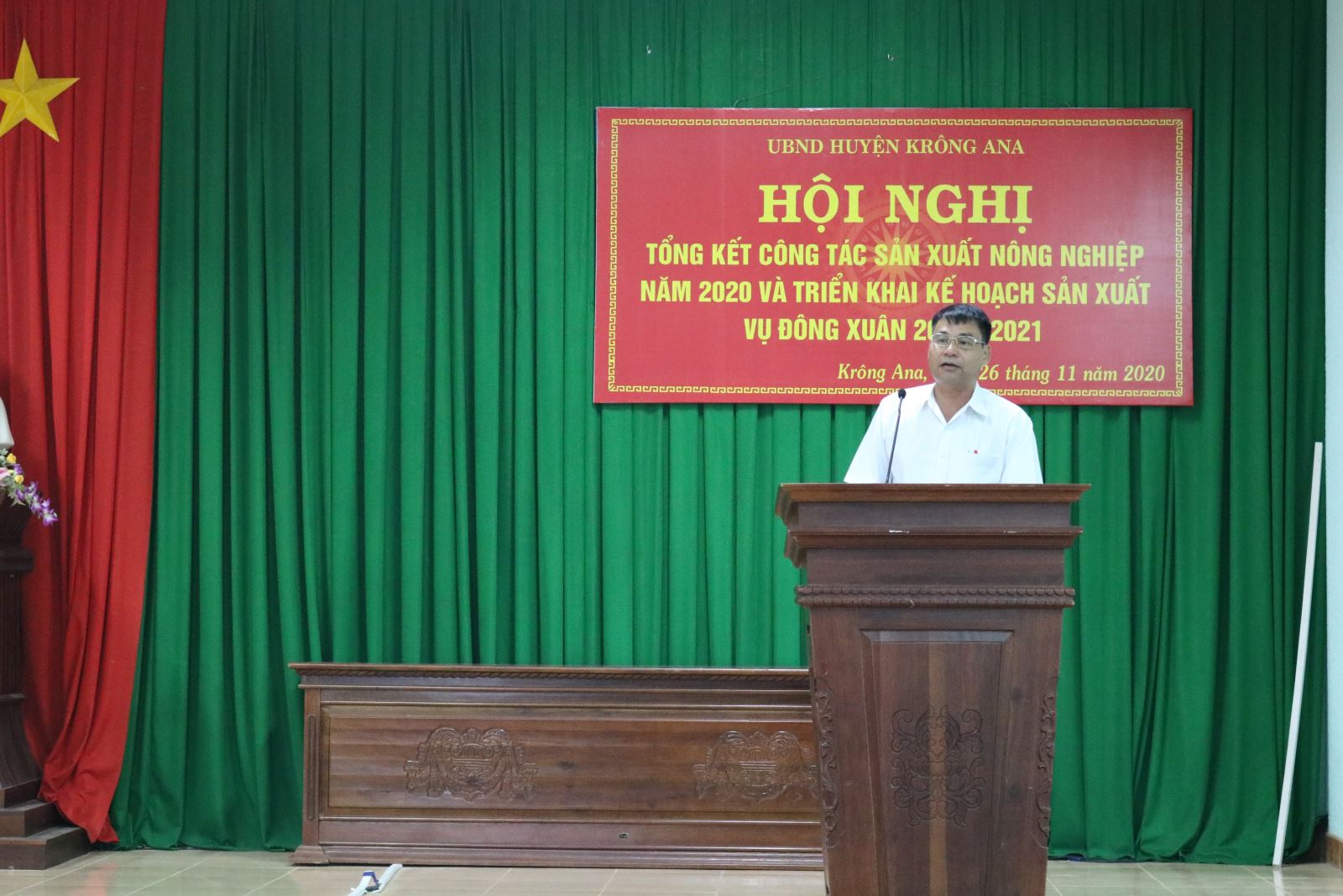 Sáng ngày 26/11/2020, UBND huyện Krông Ana tổ chức Hội nghị tổng kết công tác sản xuất nông nghiệp năm 2020 và triển khai kế hoạch sản xuất vụ Đông - Xuân năm 2020-2021. Hội nghị do đồng chí Hoàng Minh Giám, Phó Chủ tịch thường trực UBND huyện - Chủ trì. Về dự Hội nghị có đại diện lãnh đạo Chi cục Thủy sản, Chi cục Trồng trọt và Bảo vệ thực vật, Chi cục quản lý chất lượng nông, lâm, thủy sản và Trung tâm giống cây trồng, vật nuôi và thủy sản tỉnh; về phía huyện có đồng chí Nguyễn Kính, Bí thư Huyện ủy, đồng chí Y’ Tam Ê ban, Phó Chủ tịch HĐND huyện; các đồng chí đại diện Ủy ban MTTQVN huyện, lãnh đạo các Phòng, ban, ngành thuộc huyện, đại diện lãnh đạo UBND các xã, thị trấn, các hợp tác xã nông nghiệp trên địa bàn huyện.
