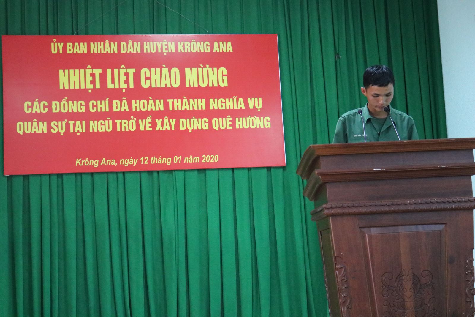 Tại buổi lễ, chiến sỹ Đinh Văn Thịnh đại diện cho 116 quân nhân xuất ngũ đợt này đã có nhữnh phát biểu thể hiện tinh thần, trách nhiệm góp sức cùng với địa phương giữ gìn an ninh chính trị, trật tự an toàn xã hội.