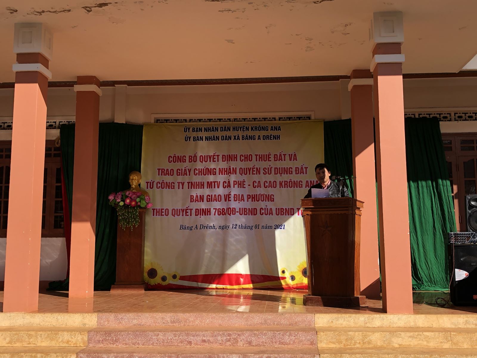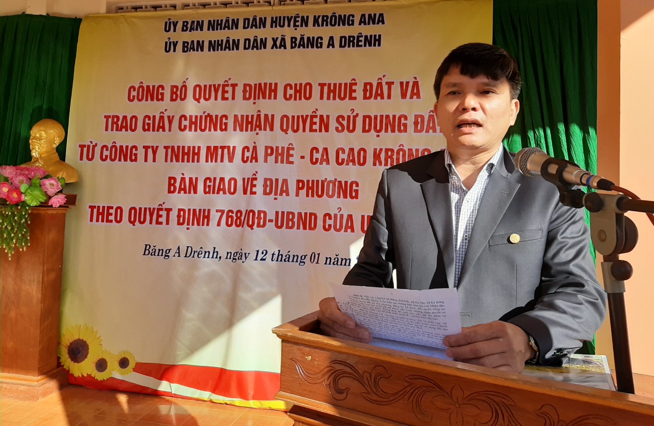Ngày 12/01/2021, UBND huyện Krông Ana tổ chức buổi Lễ ký hợp đồng thuê đất và trao Giấy chứng nhận quyền sử dụng đất từ Công ty TNHH MTV Cà phê - Ca cao Krông Ana bàn giao về địa phương cho các hộ gia đình, cá nhân tại xã Băng A Drênh. Tham dự buổi lễ có ông Trần Ngọc Dị, đại diện Hội đồng giải thể Công ty TNHH MTV Cà phê - Ca cao Krông Ana; ông Nguyễn Minh Đông - Phó Chủ tịch UBND huyện; đại diện lãnh đạo các Phòng, ban, ngành, đoàn thể của huyện. Đại diện Đảng ủy, HĐND, UBND, các đoàn thể các xã, thị trấn và các hộ dân tham gia ký hợp đồng thuê đất và nhận Giấy chứng nhận quyền sử dụng đất tại xã Băng A Drênh.