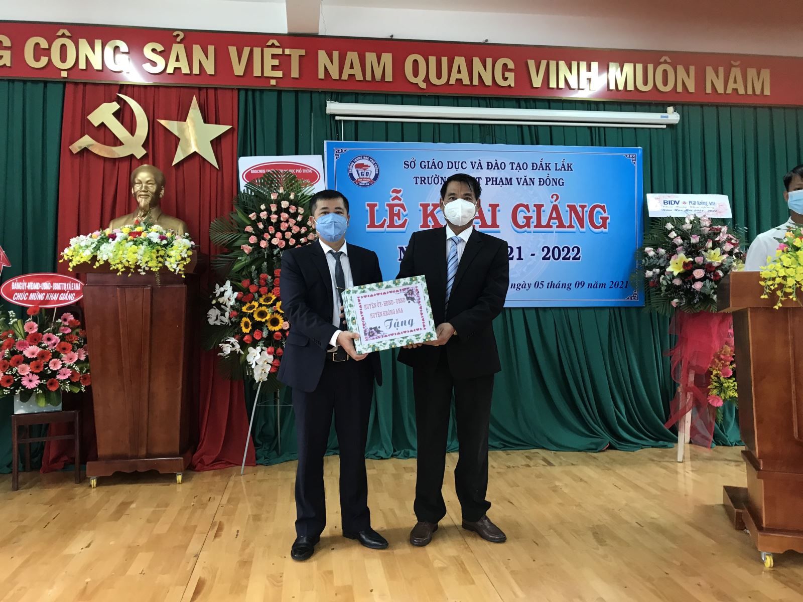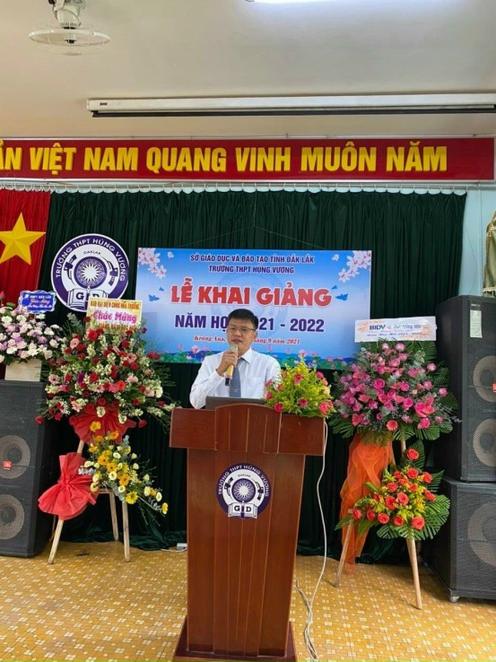 Đồng chí Nguyễn Minh Đông, Phó chủ tịch UBND huyện chúc mừng thầy, cô trường THPT Hùng Vương, thị trấn Buôn Trấp nhân dịp khai giảng năm học 2021 - 2022