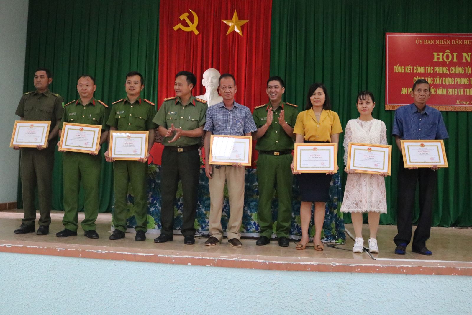 Đồng chí Y Nem Buôn Krông, PBT TT Huyện ủy và đồng chí Trần Hữu Thọ, PCT UBND huyện ặng giấy khen cho các tập thể có thành tích trong phong trào toàn dân bảo vệ an ninh tổ quốc năm 2019