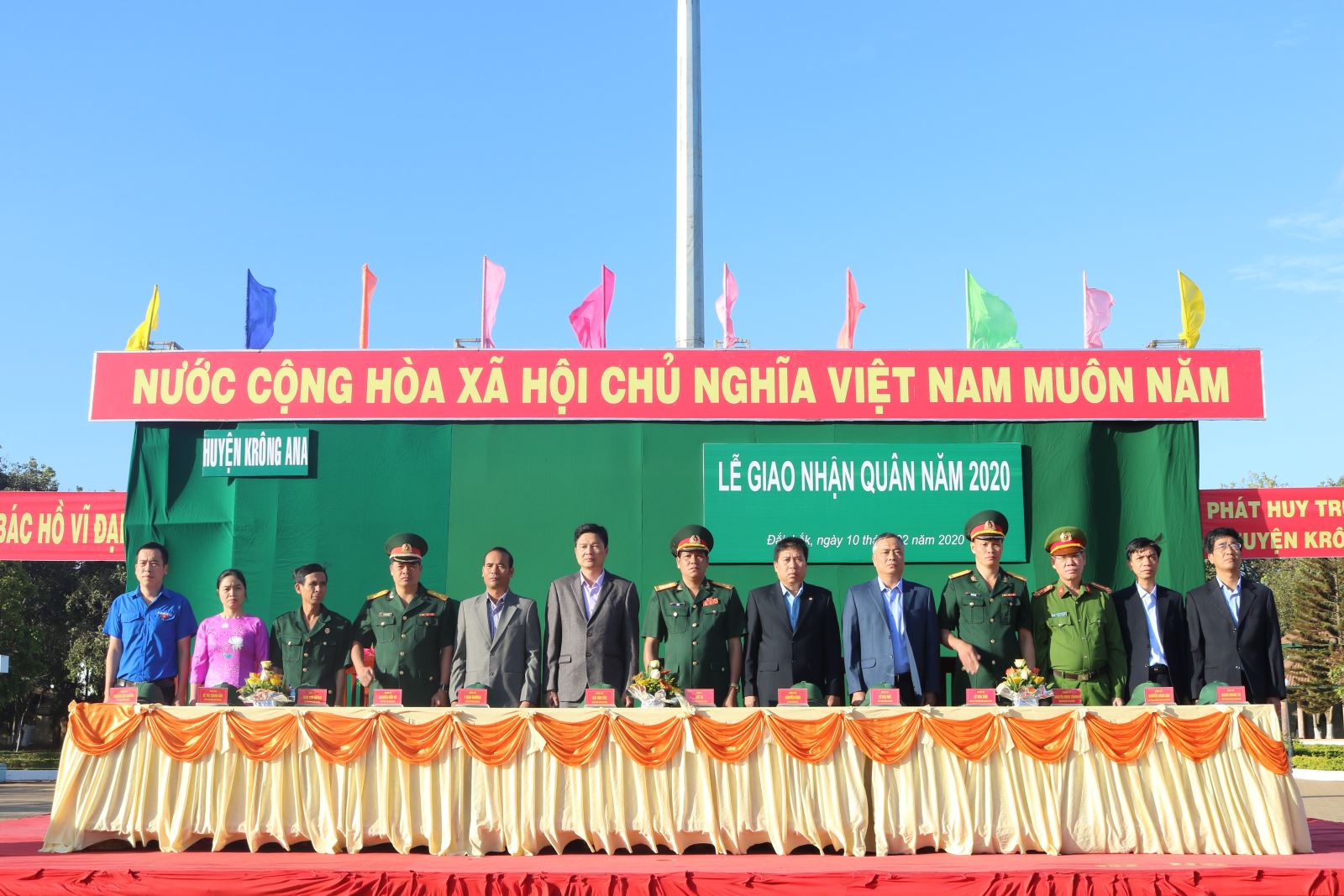 Sáng 10/02/2020, tại Hoa viên huyện Krông Ana, Hội đồng nghĩa vụ quân sự huyện đã long trọng tổ chức Lễ giao, nhận quân năm 2020. Tham dự buổi Lễ có đồng chí Bùi Văn Yên, Giám đốc Sở Tài chính; đồng chí Niê Ta, Phó Chỉ huy trưởng Bộ CHQS tỉnh; đồng chí Nguyễn Kính, Bí thư Huyện ủy, đồng chí Y Nem Buôn Krông - Phó Bí thư thường trực Huyện ủy, Chủ tịch HĐND huyện; đồng chí Võ Đại Huế, Chủ tịch UBND huyện - Chủ tịch Hội đồng nghĩa vụ quân sự huyện; các thành viên Hội đồng NVQS huyện; đại diện Đảng ủy, HĐND, UBND, Hội đồng NVQS các xã, thị trấn cùng 145 thanh niên lên đường nhập ngũ năm 2020.