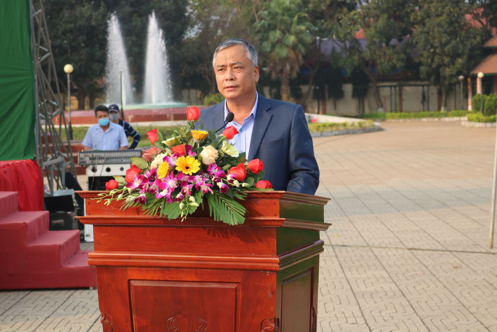 Đồng chí Võ Đại Huế, Phó Bí thư Huyện ủy, Chủ tịch UBND huyện phát biểu tại Lễ giao, nhận quân năm 2021