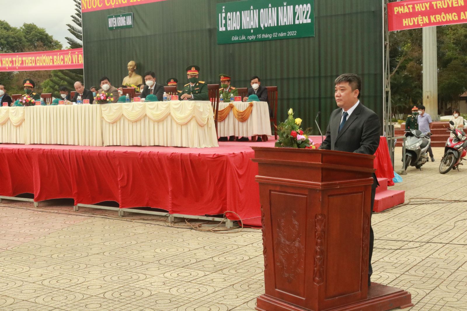 Đồng chí Nguyễn Thanh Vũ, Chủ tịch UBND huyện, Chủ tịch HĐNVQS sự huyện phát biểu tại Lễ giao, nhận quân năm 2022