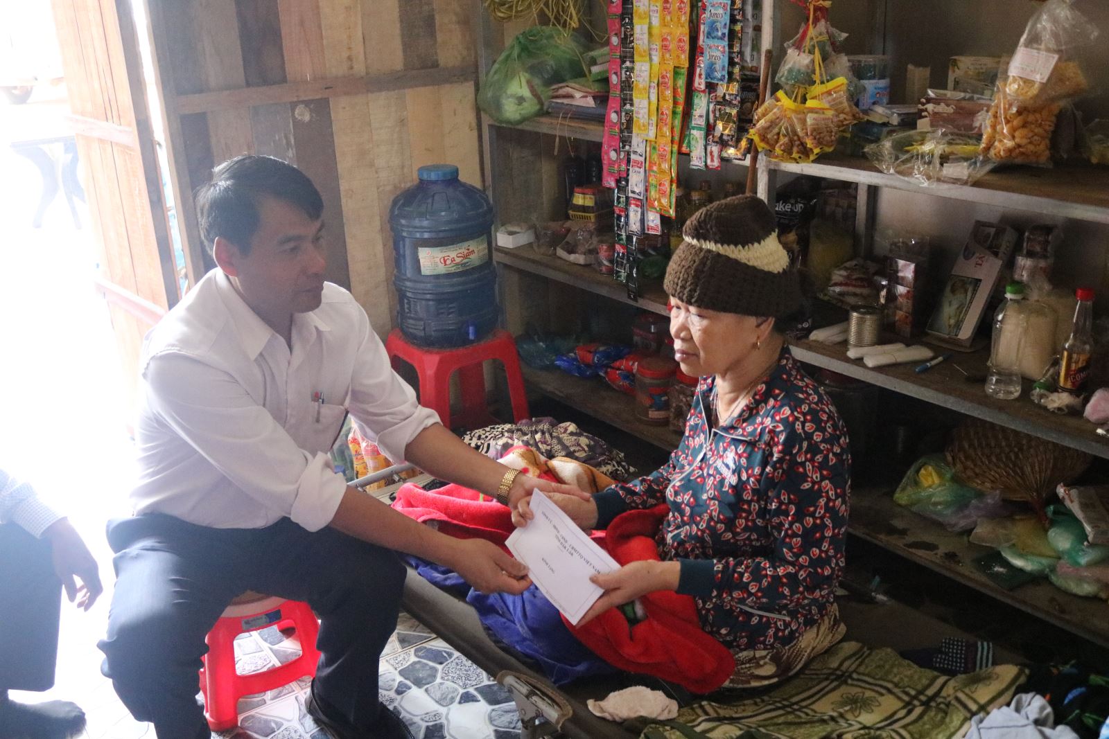 Đồng chí Hoàng Minh Giám, Phó Chủ tịch thường trực tặng quà cho bệnh binh nặng H’ Ben Byă