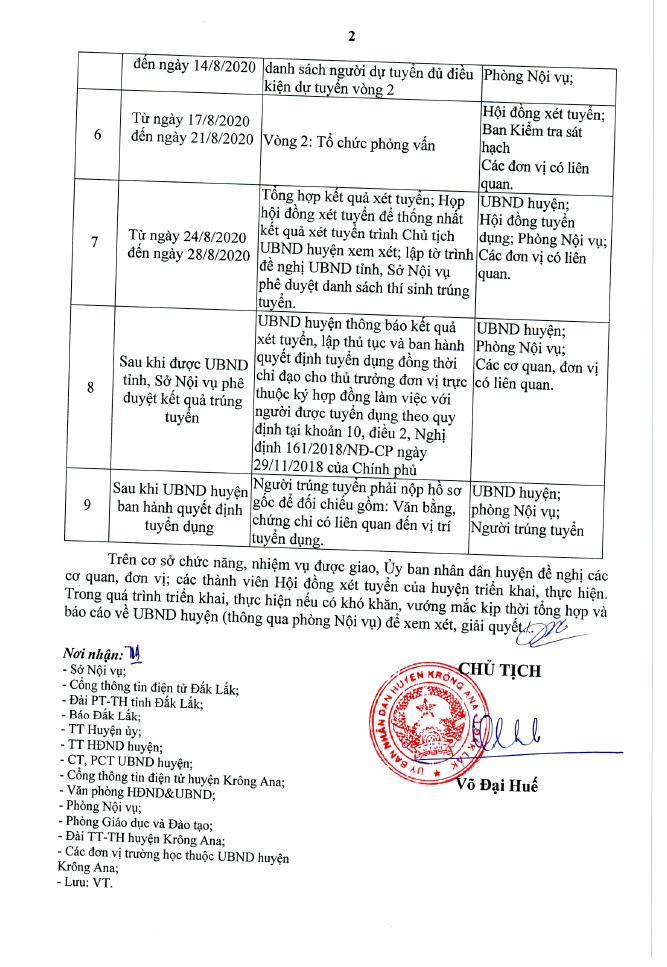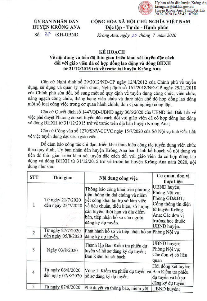 Kế hoạch về nội dung và tiến độ thời gian triển khai xét tuyển đặc cách đối với giáo viên đã có hợp đồng lao động và đóng BHXH trước ngày 31/12/2015 trở về trước tại huyện Krông Ana