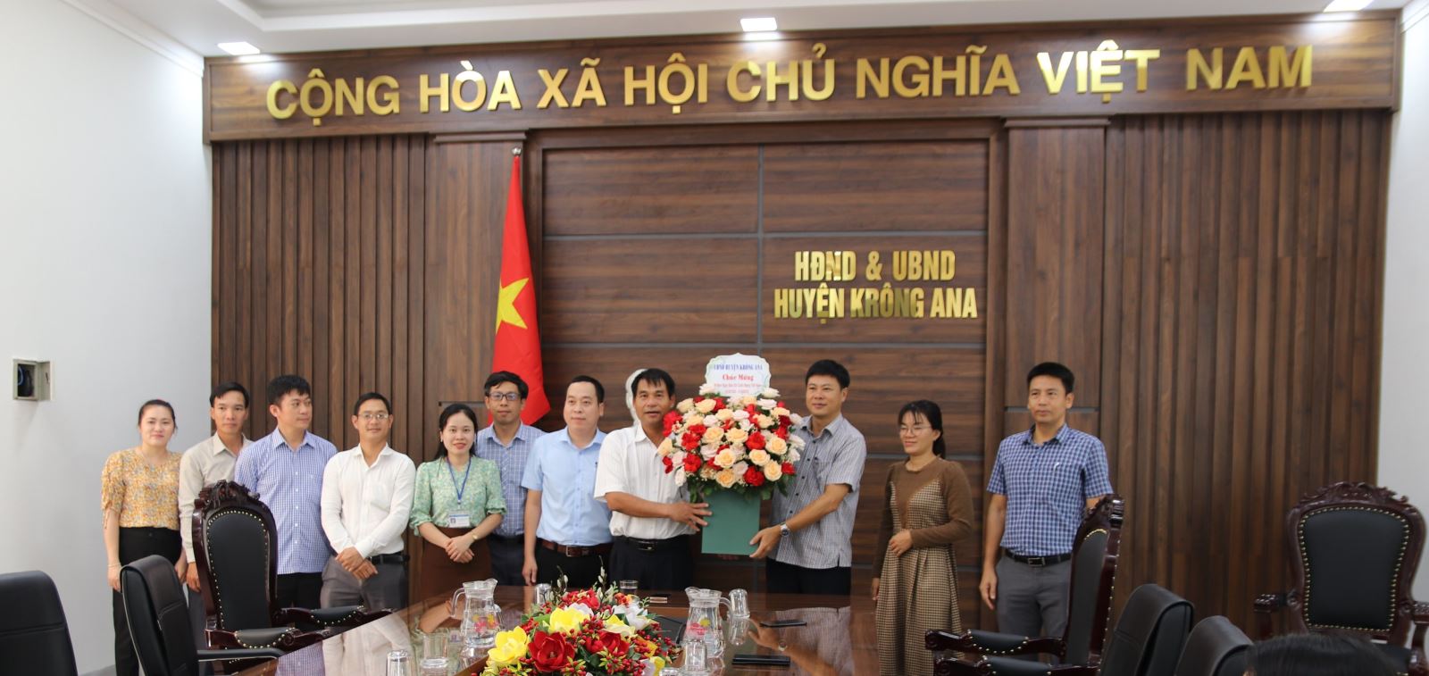 Đ/c Nguyễn Kính - Bí thư Huyện ủy, Chủ tịch HĐND huyện tặng hoa chức mừng cán bộ, viên chức Trung tâm Truyền thông - Văn hóa - Thể thao huyện