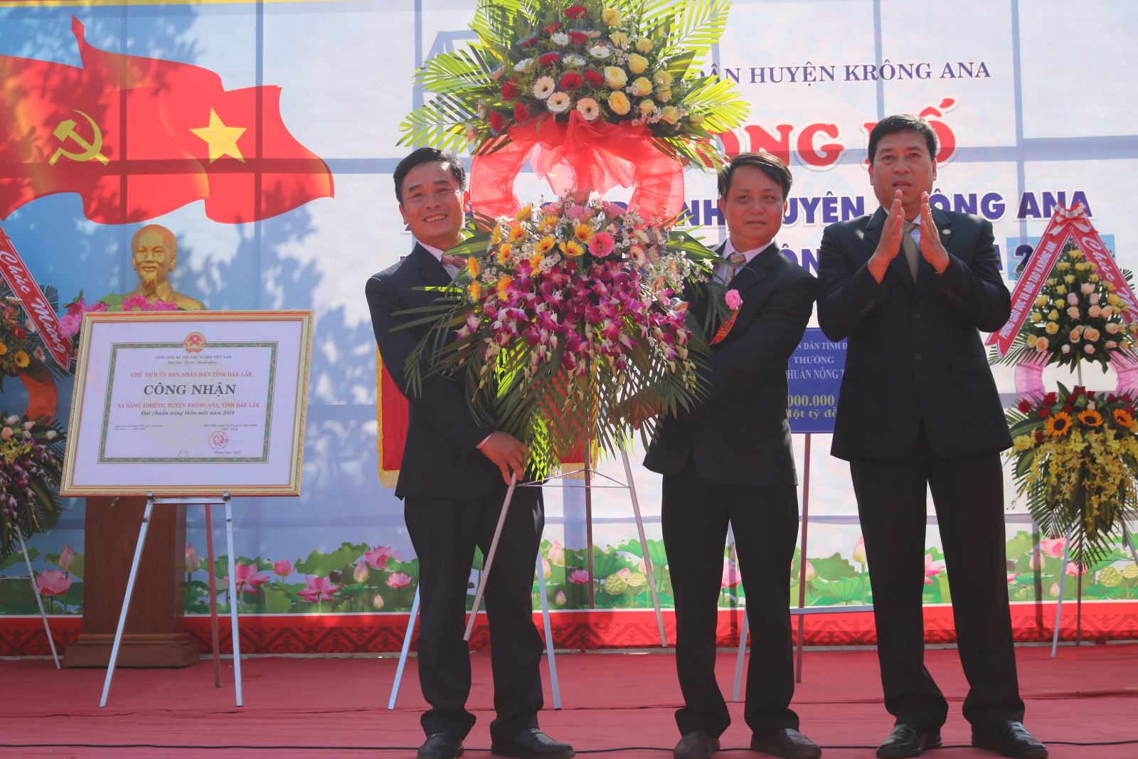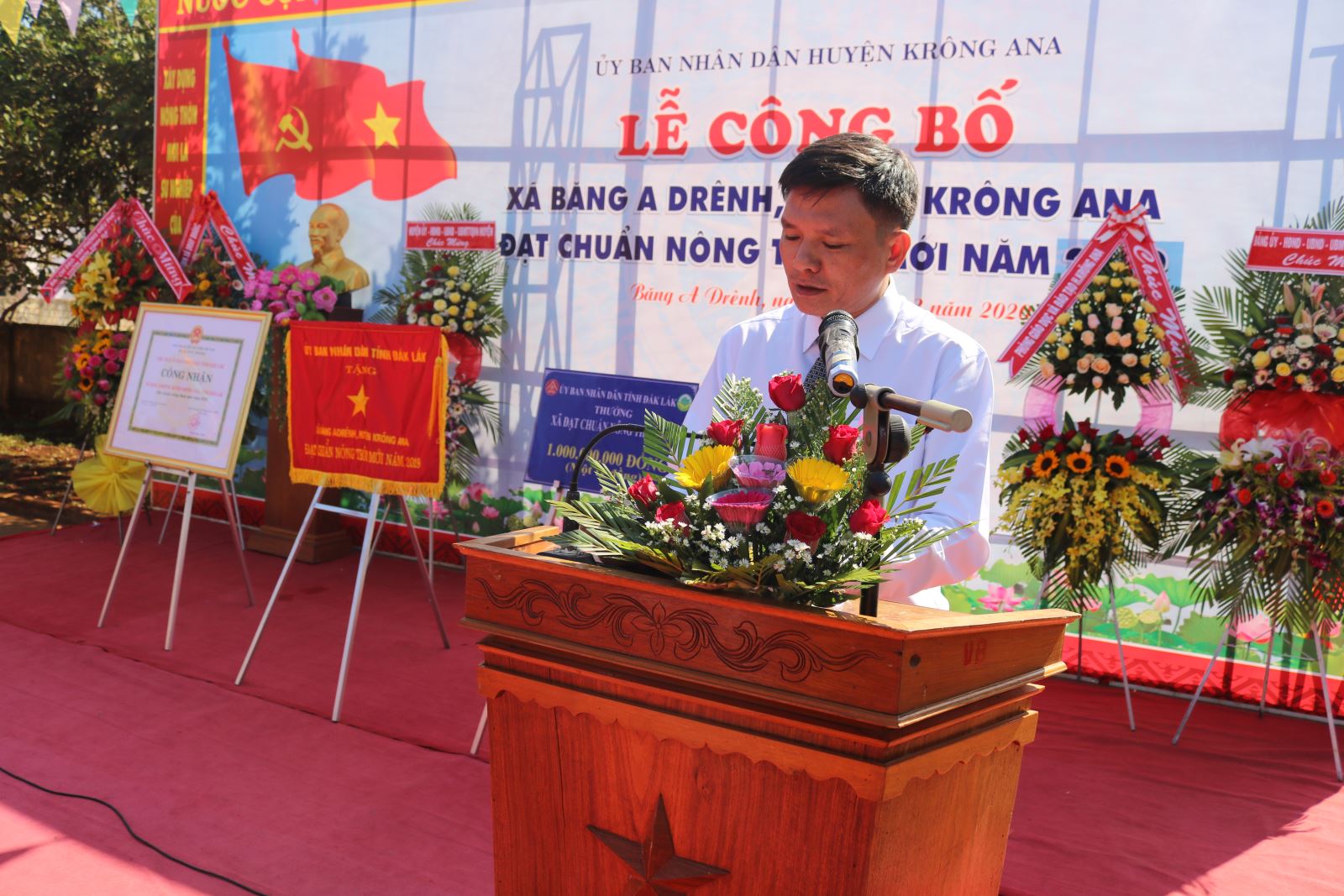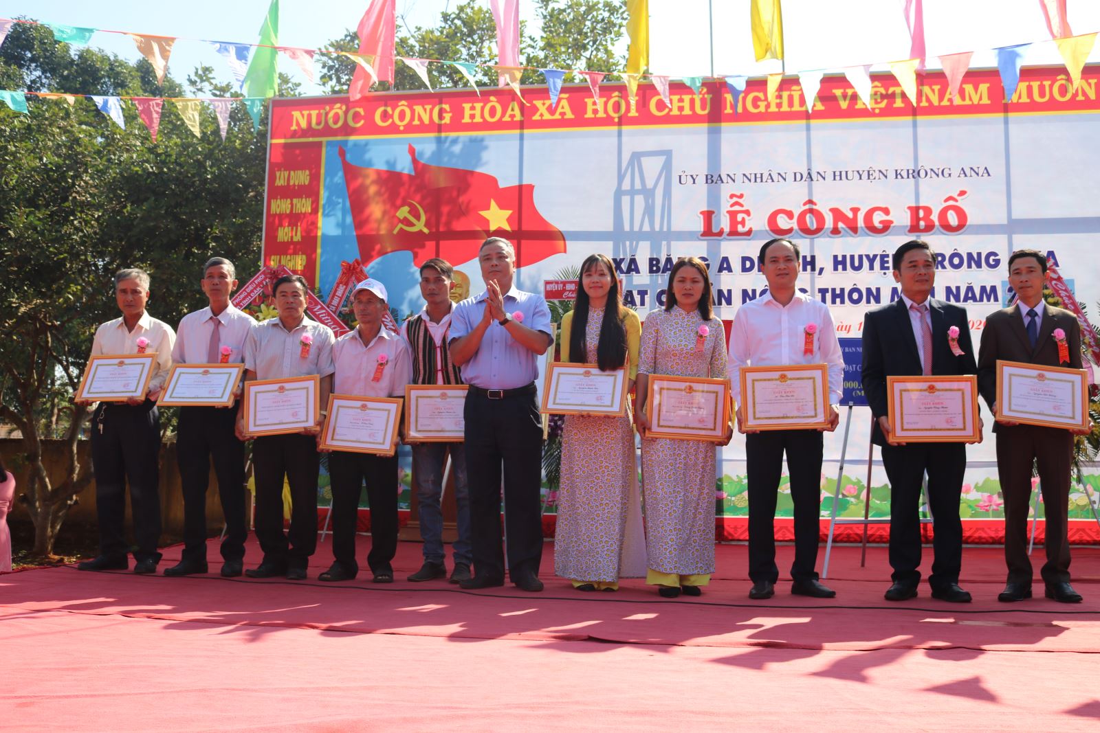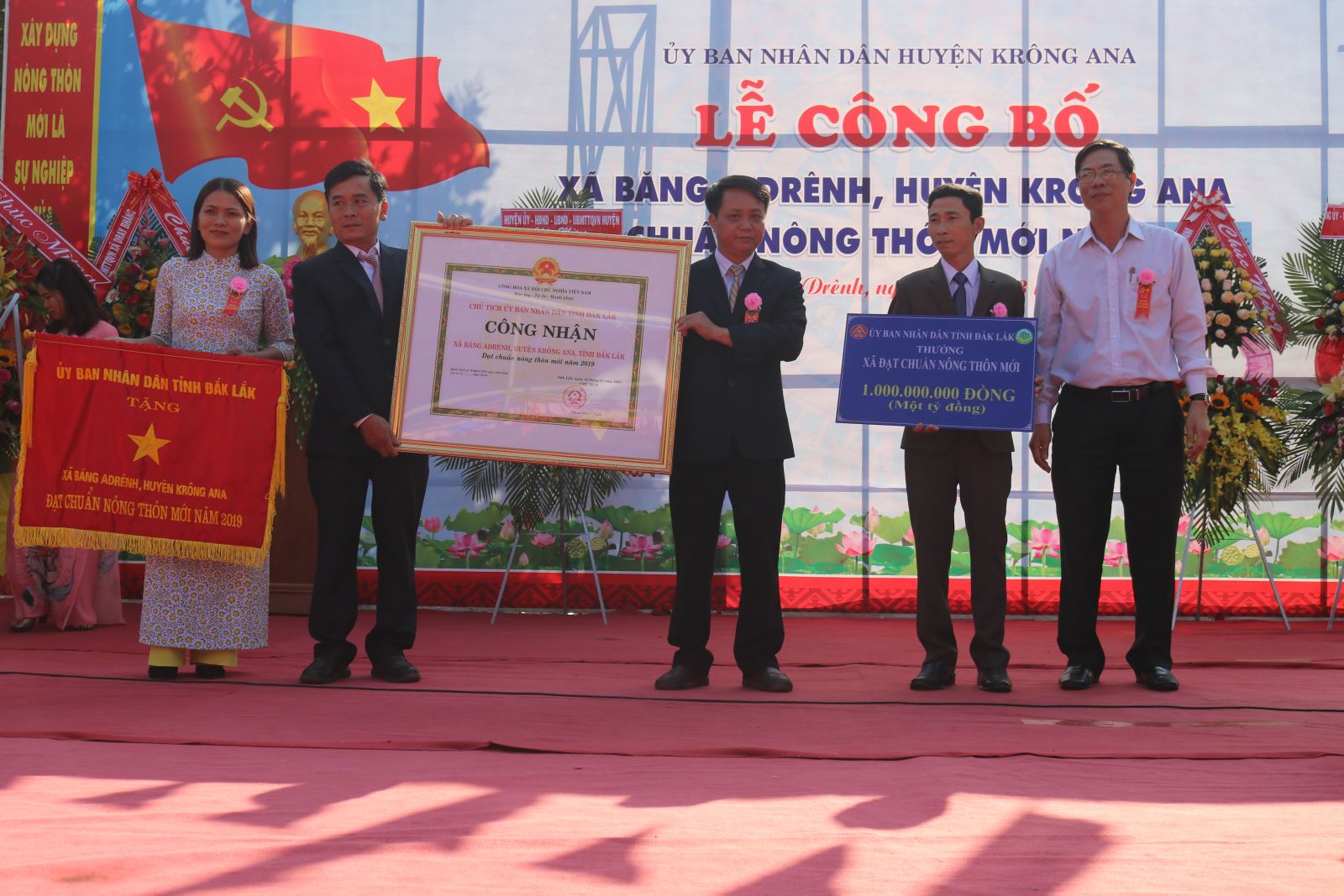 Nhân dịp này, đại diện Ban Chỉ đạo các Chương trình mục tiêu quốc gia tỉnh đã trao Bằng Công nhận xã Băng A Drênh đạt chuẩn NTM, Cờ thi đua và phần thưởng 1 tỷ đồng đầu tư công trình công trình phúc lợi xã hội cho UBND xã Băng A Drênh. UBND huyện tặng Giấy khen cho 3 tập thể và 7 cá nhân có thành tích xuất sắc trong thực hiện chương trình NTM trên địa bàn xã Băng A Drênh.