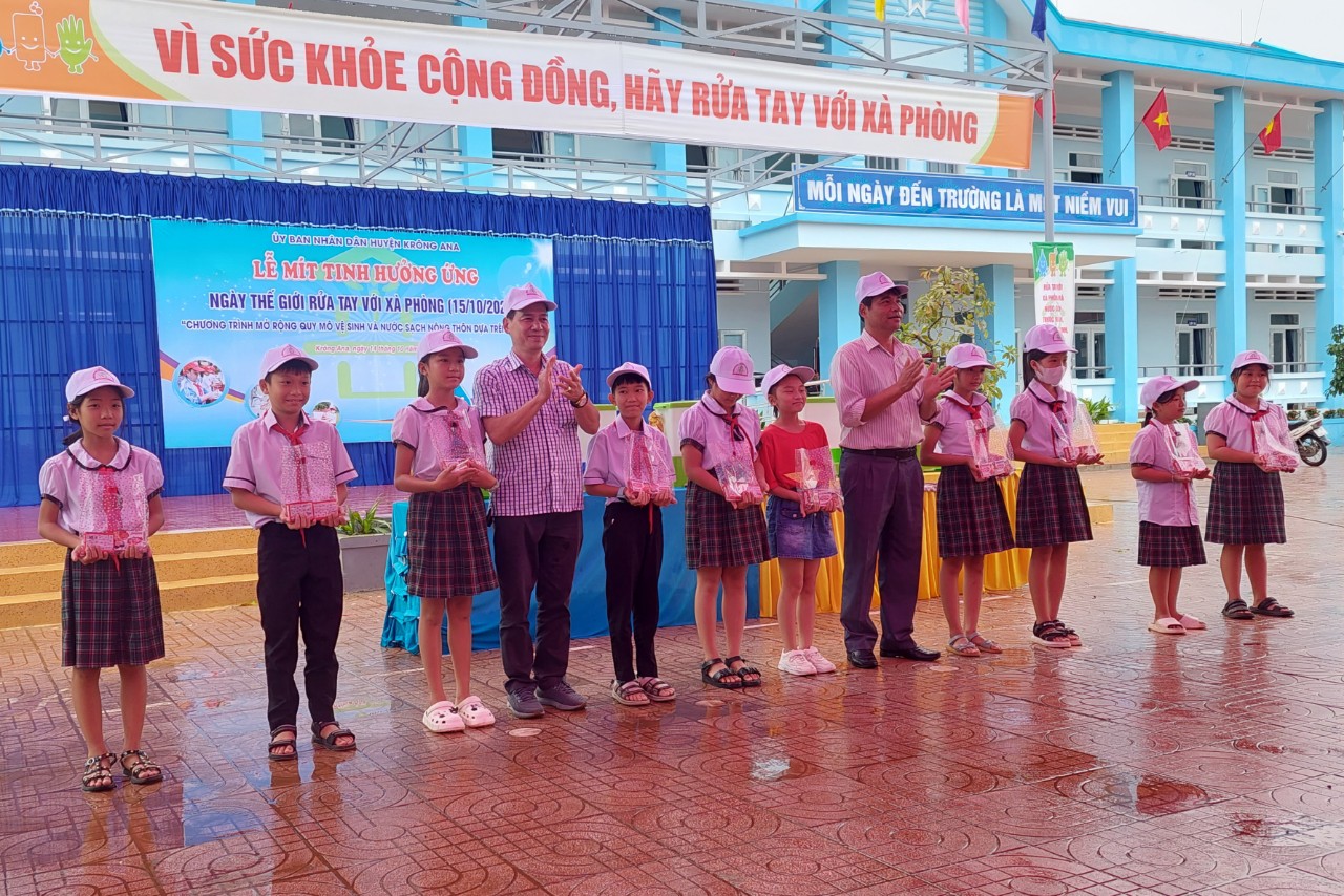 Tại buổi Lễ các đại biểu và các em học sinh cùng thực hành rửa tay bằng xà phòng và tặng 300 bánh xà phòng cho các em sinh trường TH Trần Phú.
