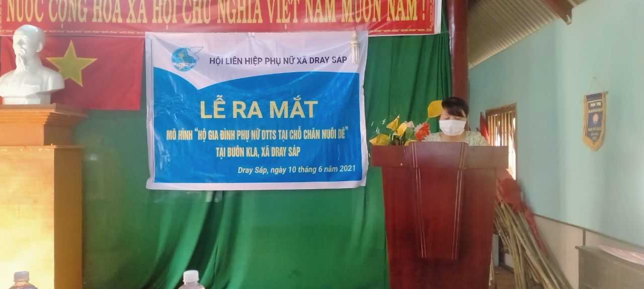 Thực hiện chỉ đạo của Hội LHPN huyện, ngày 10/6/2021, Hội LHPN xã Dray Sáp tổ chức Lễ ra mắt mô hình “Hộ gia đình Phụ nữ DTTS tại chỗ chăn nuôi dê” tại Buôn Kla, xã Dray Sáp. Về dự buổi Lễ có đồng chí H’Gun Niê - Phó Chủ tịch Hội LHPN huyện, các đồng chí lãnh đạo đại diện UBMTTQ Việt Nam và các tổ chức đoàn thể của xã; đại diện Cấp ủy chi bộ, Ban tự quản, Chi hội trưởng, Chi hội phó Hội Phụ nữ cùng hội viên phụ nữ Buôn Kla.