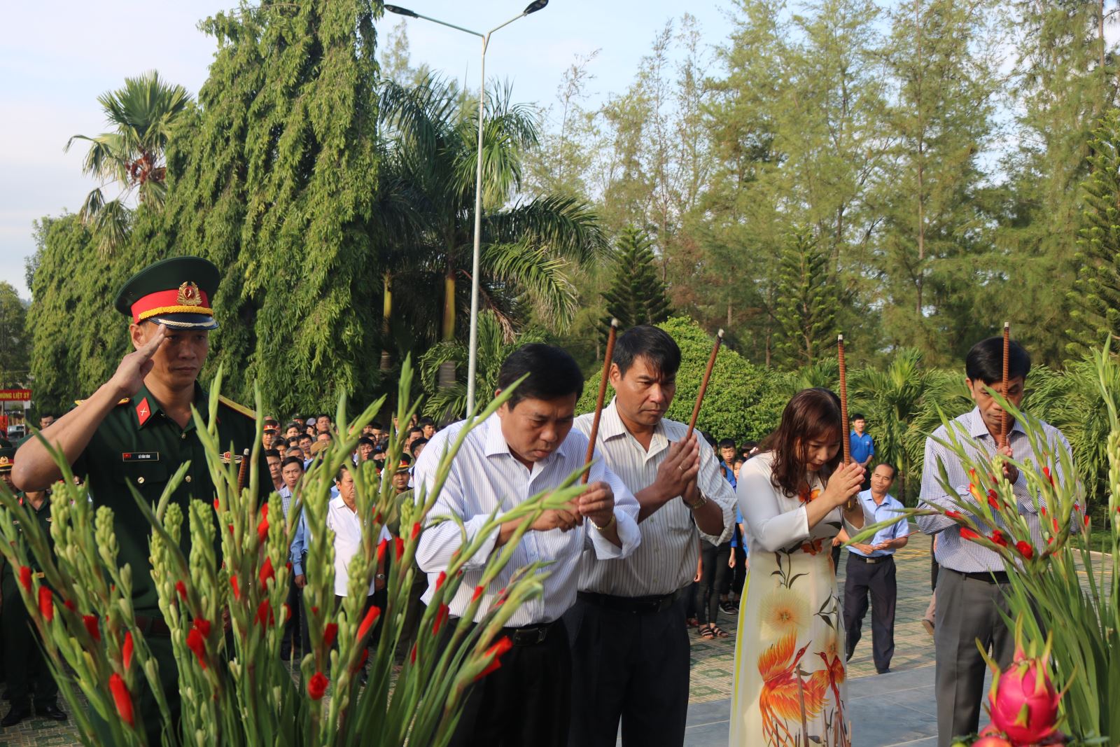 Trong không khí trang nghiêm, thành kính các đồng chí lãnh đạo huyện đã dâng hoa, thắp hương, kính cẩn nghiêng mình bày tỏ lòng biết ơn sâu sắc đến các Anh hùng liệt sỹ đã hy sinh vì nền độc lập, tự do của Tổ quốc; nguyện một lòng đoàn kết, tiếp nối truyền thống cách mạnh của các thế hệ cha ông, ra sức phấn đấu xây dựng quê hương, đất nước ngày càng phát triển, văn minh, giàu đẹp.