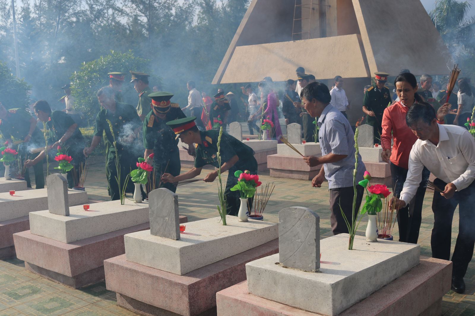 Sau phần Nghi lễ, các đồng chí lãnh đạo huyện, cán bộ, công chức, viên chức, người lao động các cơ quan, ban, ngành, đoàn thể và các em học sinh trường THCS Lương Thế Vinh đại diện cho học sinh toàn huyện đã đến thắp hương từng phần mộ để tỏ lòng biết ơn với các thế hệ cha ông đã cống hiến sức trẻ cho nền độc lập dân tộc.