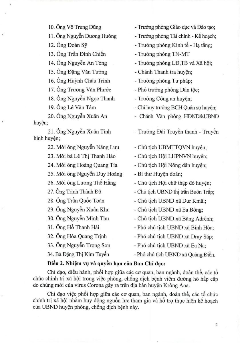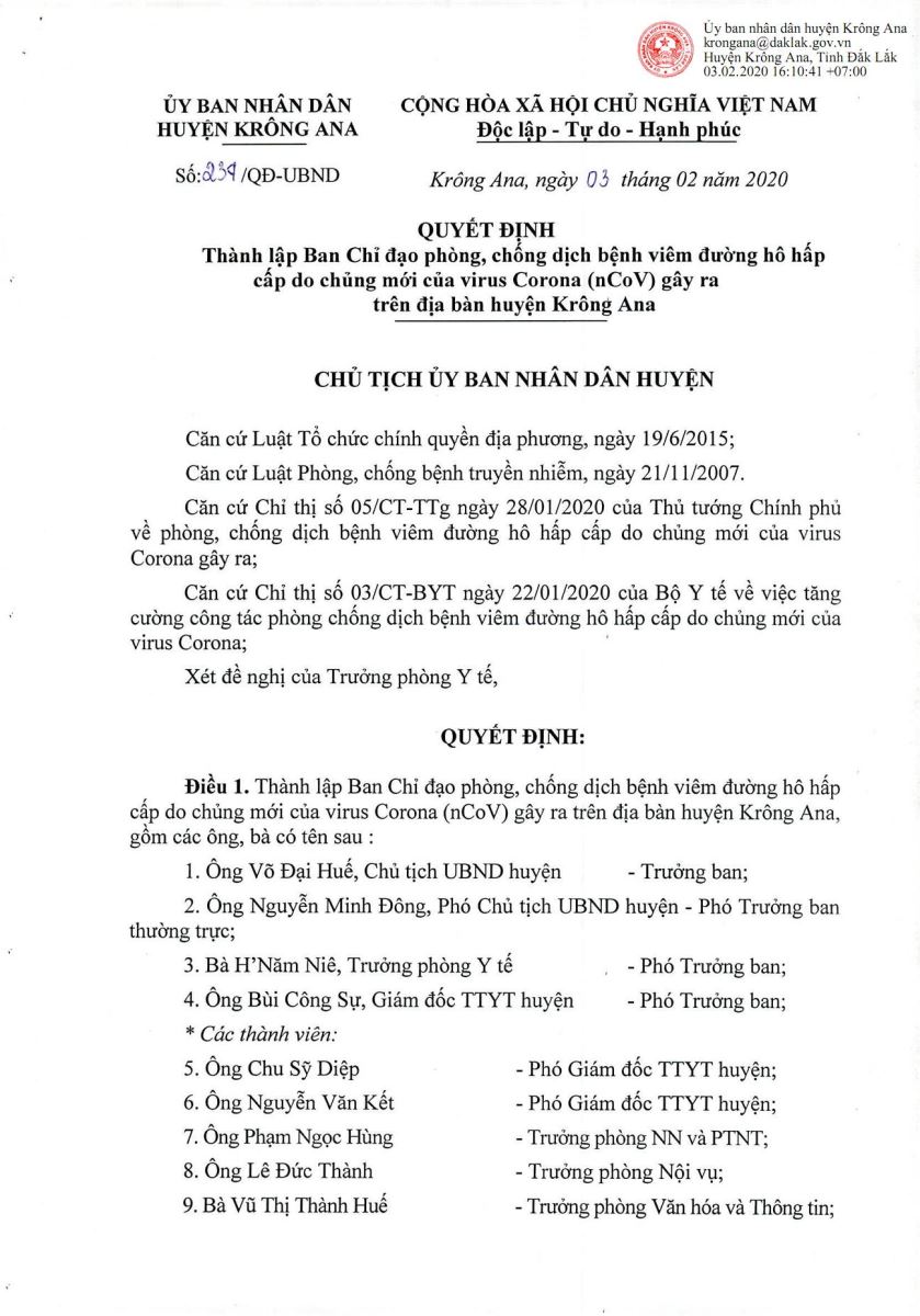 Quyết định thành lập Ban Chỉ đạo phòng, chống dịch bệnh viêm đường hô hấp cấp do chủng mới của Vi rút Corona gây ra trên địa bàn huyện Krông Ana