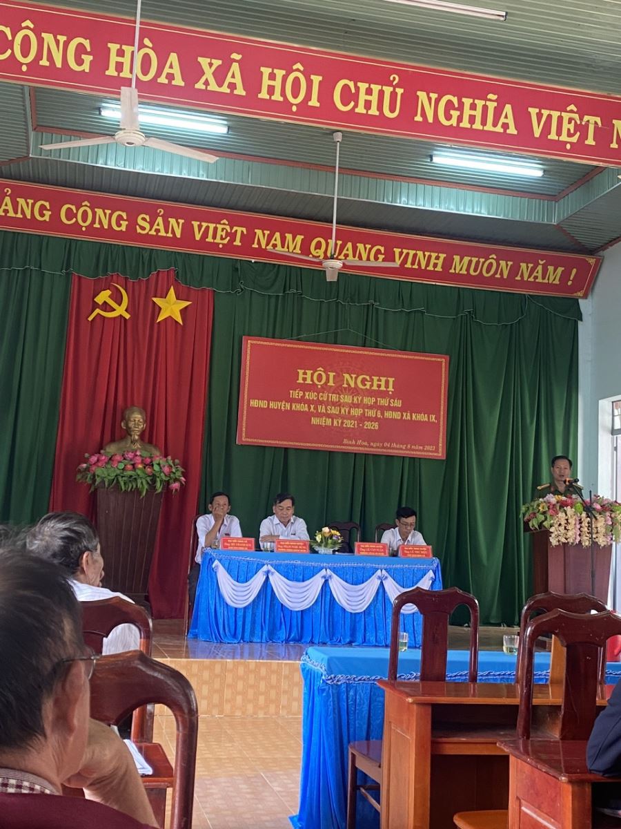 Sáng ngày 04/8/2023, tại Hội trường UBND xã Bình Hòa đã diễn ra Hội nghị tiếp xúc cử tri sau kỳ họp thứ Sáu, HĐND huyện khóa X và HĐND xã khóa IX, nhiệm kỳ 2021 - 2026. Về dự hội nghị có ông Lê Văn Tuấn, Trưởng Công an huyện; ông Nguyễn Ngọc Hùng, Trưởng phòng Nông nghiệp và Phát triên nông thôn; bà Vũ Thị Thành Huế, Trưởng Phòng Văn hoá và Thông tin; Lãnh đạo Đảng ủy, HĐND, UBND xã; Đại diện các ban, ngành, đoàn thể; và đại diện cho 70 cử tri trên địa bàn xã Bình Hòa.