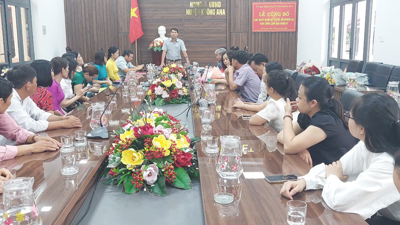 Tại buổi lễ, ông Hoàng Ngọc Long, Phó Trưởng phòng Nội vụ thừa ủy quyền Chủ tịch UBND huyện đã công bố các Quyết định bổ nhiệm lại, chuyển công tác, và bổ nhiệm viên chức lãnh đạo quản lý.