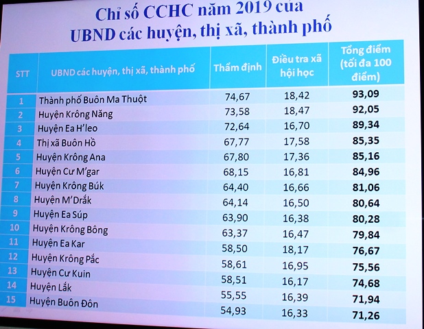 UBND thành phố Buôn Ma Thuột là địa phương giữ vững chỉ số 3 năm liền đạt trên 93% và 14 địa phương còn lại đạt chỉ số 71% đến dưới 93%, không có địa phương nào có chỉ số dưới 50%. Chỉ số CCHC tăng đều ở các địa phương nhưng chỉ số thành phần xây dựng và triển khai văn bản quy phạm pháp luật ở mức thấp như: huyện Krông Pắc, Eakar, Buôn Đôn, Krông Búk. Công tác điều tra xã hội học để lấy ý kiến các nhóm đối tượng khác nhau về kết quả CCHC phục vụ cho xác định chỉ số CCHC năm 2019 được tổ chức đúng đối tượng, đúng quy định, đảm bảo thời gian và tỷ lệ thu hồi phiếu cao.