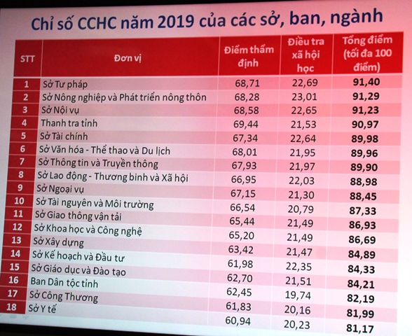 Đối với các Sở, ban, ngành, năm 2019 là năm đầu tiên Sở Tư pháp đứng đầu với số điểm 91,40 điểm; đứng thứ 2 là Sở NN&PTNT với số điểm 91,29 điểm, thứ ba là Sở Nội vụ với 91,23 điểm. Có 5 đơn vị đứng cuối là: Sở kế hoạch đầu tư 84,33 điểm, Sở Giáo dục và Đào tạo 84,21 điểm, Ban Dân tộc tỉnh 82,19 điểm, Sở Công Thương 81,99 điểm và Sở Y tế đạt 81,17 điểm.