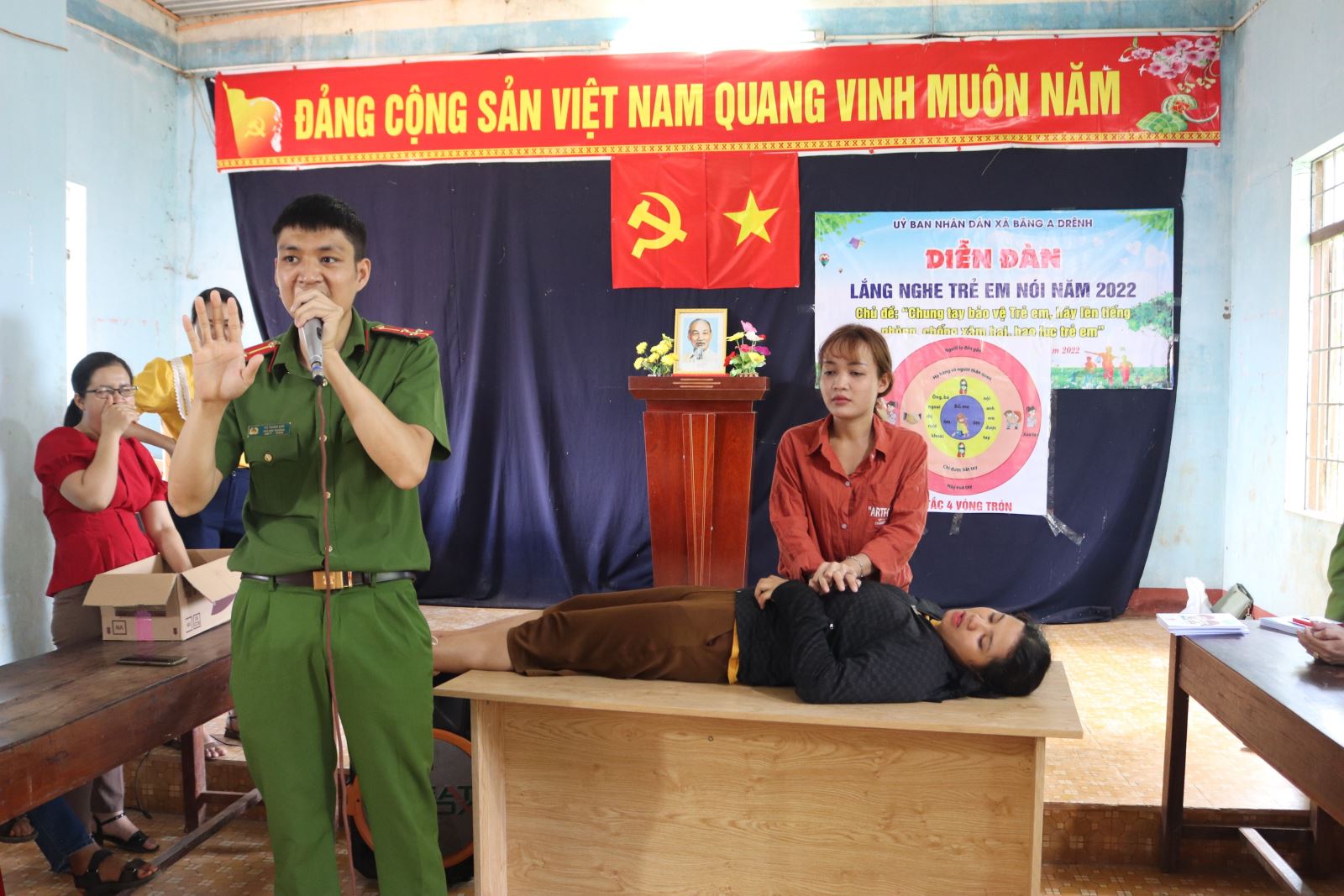 Tại Diễn đàn, các em thiếu nhi đã được giao lưu văn nghệ, ca múa hát và được các đồng chí Công an huyện, cán bộ UBND xã và trưởng buôn tuyên truyền, hướng dẫn phòng, chống đuối nước, tai nạn thương tích, xâm hại tình dục và bạo lực học đường.