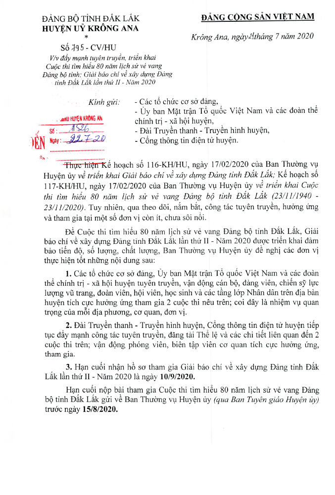 Về việc đẩy mạnh tuyên truyền, triển khai cuộc ti tìm hiểu 80 năm lịch sử vẻ vang Đảng bộ tỉnh; Giải báo chí về xây dựng Đảng tỉnh Đắk Lắk lần thứ II, năm 2020