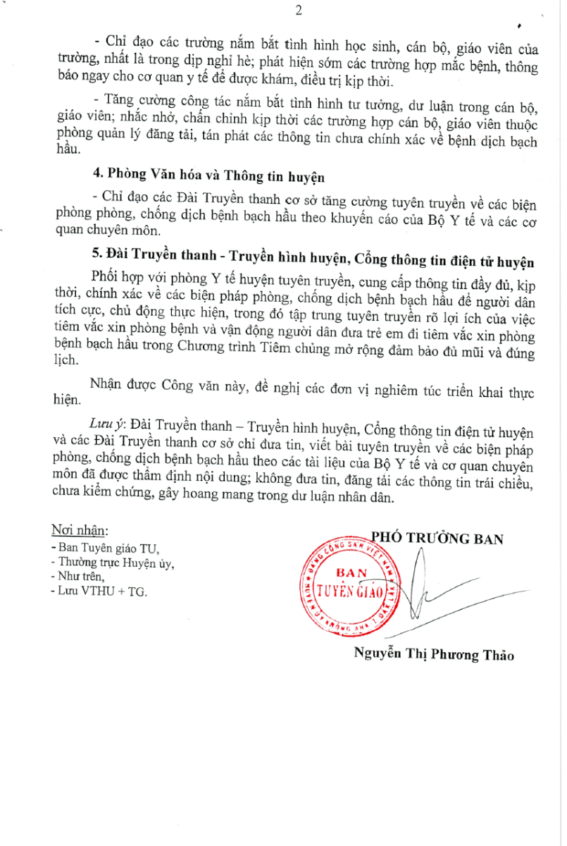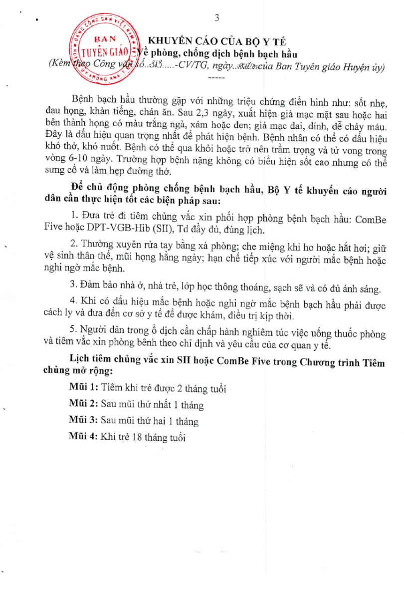 Về việc tăng cường tuyên truyền phòng, chống dịch bệnh bạch hầu trên địa bàn huyện