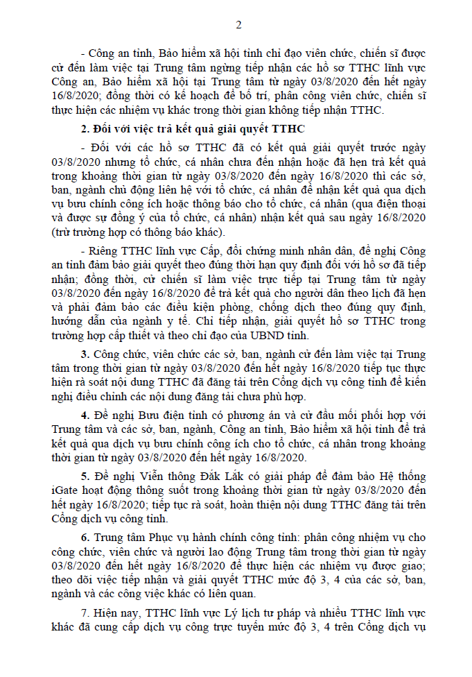 Về việc tiếp nhận và trả kết quả giải quyết hồ sơ TTHC tại Trung tâm phục vụ hành chính công tỉnh trong thời gian từ ngày 03/8/2020 đến hết ngày 16/8/2020